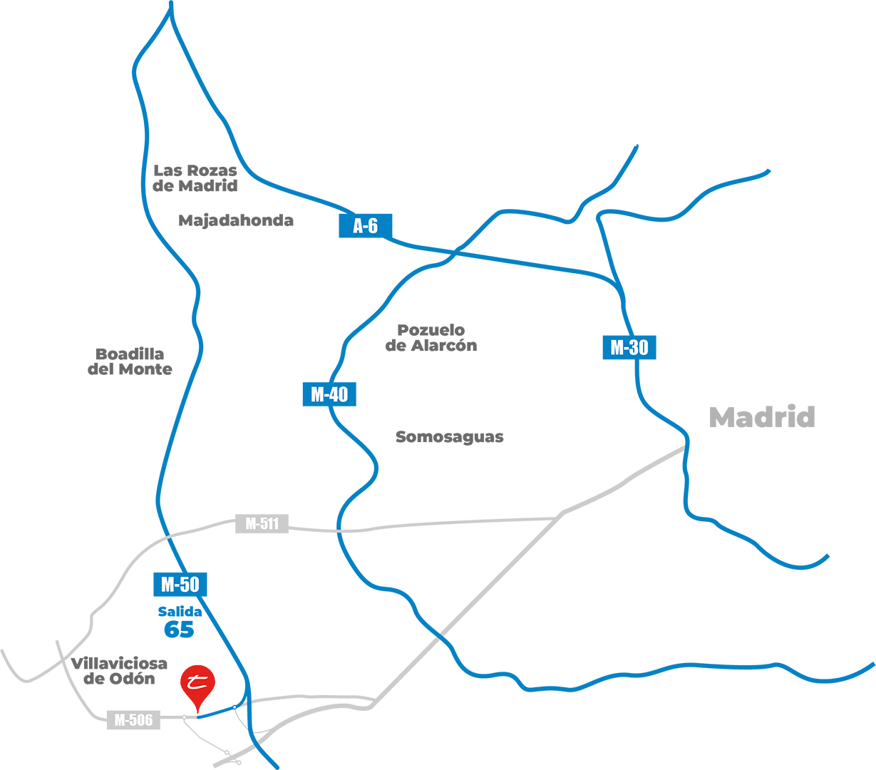 La nave de TAREDBLAU se encuentra al Oeste de Madrid, en la carretera M-506, que va de la M50 a Villaviciosa de Odón, con acceso muy sencillo desde la M50 (salida 65 viniendo desde el norte ó 64 si se viene desde el sur).